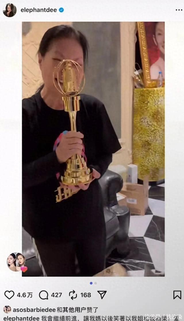 12月10日小S更新动态,晒出她把自己的金钟奖奖杯送给S妈的视频。 配文:我会继续前进,让我妈笑着以我姐和我为荣!爱你momforever.