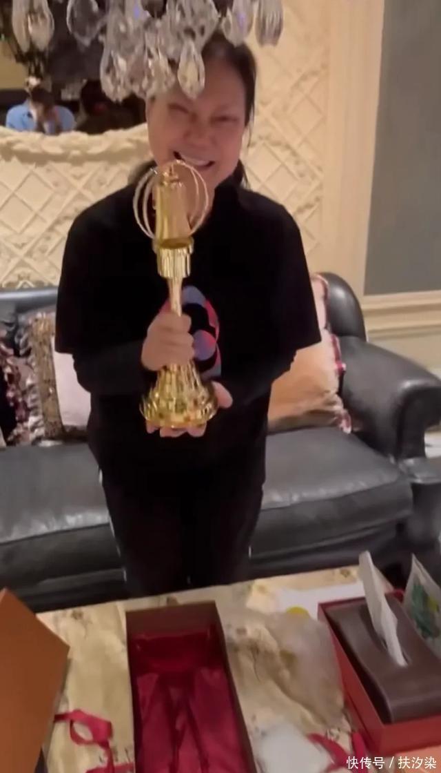视频中最先传出的是S妈惊喜的尖叫和笑声,接着她双手捧出奖杯,特意挪步到好拍摄的地方,忍着泪憋着哭腔说,“补上了我的心,谢谢宝贝。”
