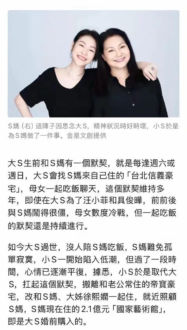 大S在世的时候是S家的顶梁柱,既负责赚钱养家也是家里大事小事的主心骨。 S妈现在住的艺术馆房子就是大S买的,现在大姐徐熙娴也住在里面。